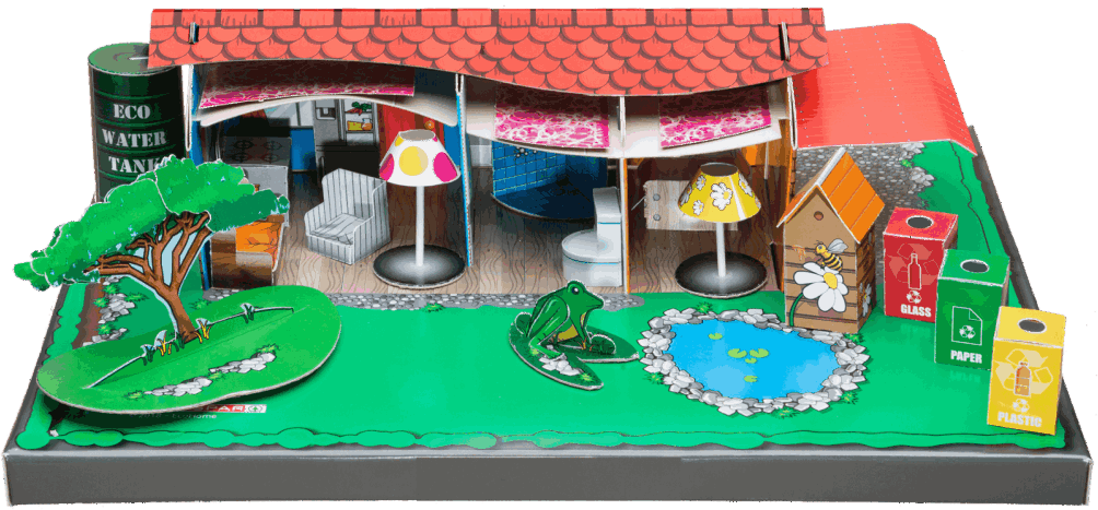 EcoHome presents nine lessons, each one accompanied by a child-friendly story. There is a model of a cardboard home to be assembled by learners with sixteen practical and colourful items that illustrate crucial environmental saving devices.